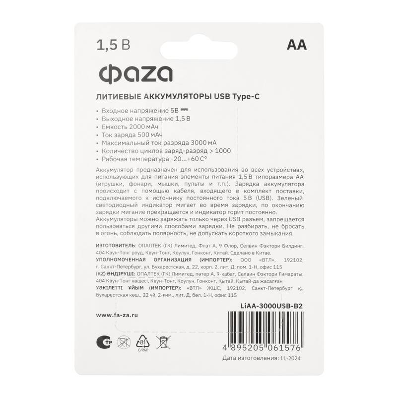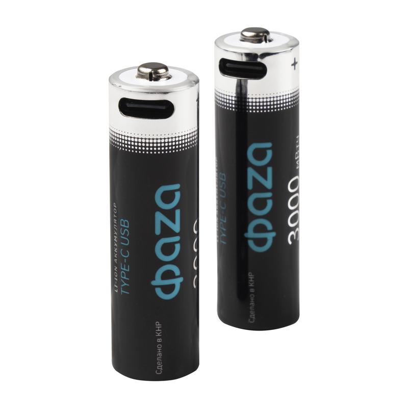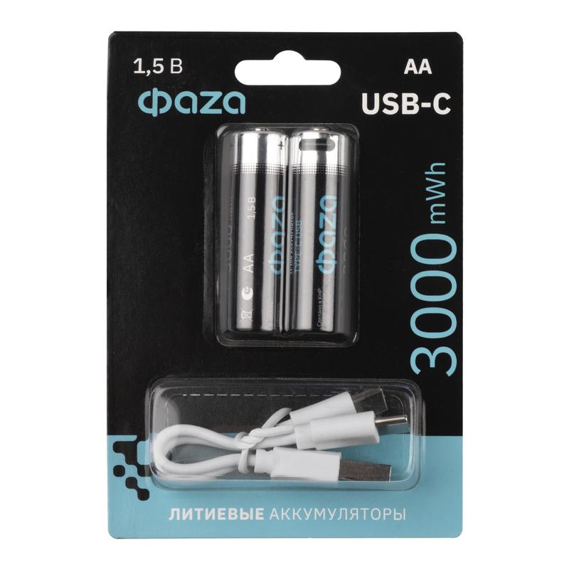 Аккумулятор литиевый AA 1.5В Li-Ion 3000мВт.ч 2000мА.ч зарядка от Type-C шнур в комплекте BL-2 (уп.2шт) ФАZА 5061576