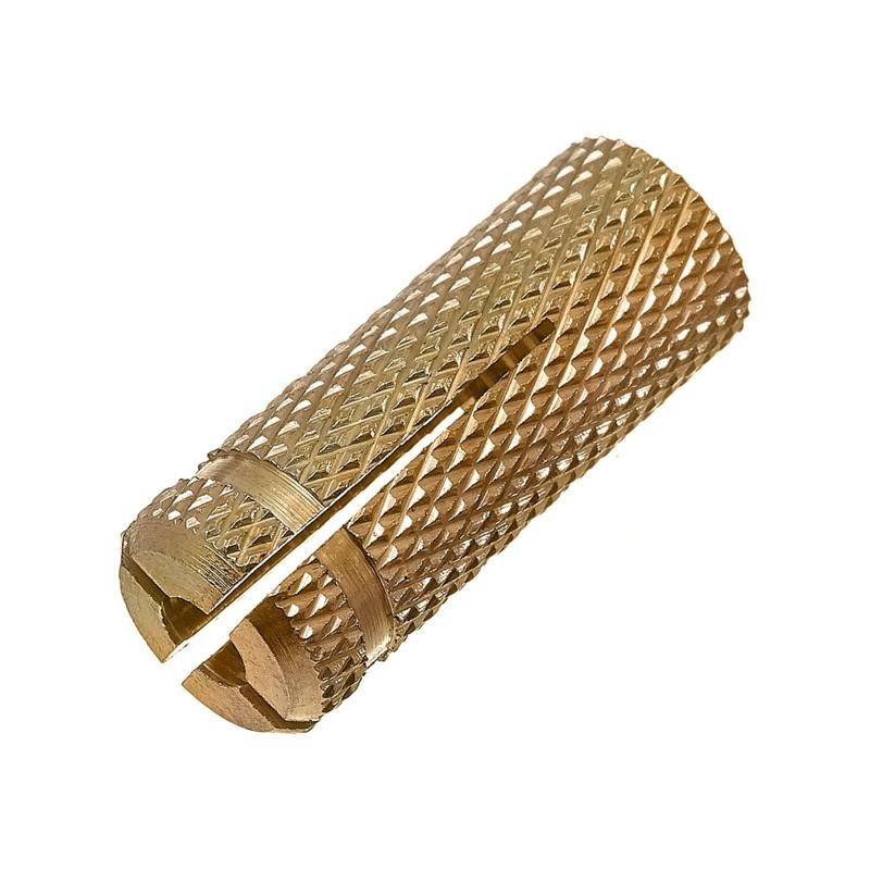 Несмотря на то, что латунь относится к цветным металлам, по цене это сравнительно недорогое изделие, так как размеры его малы. Забивной анкер представляет собой втулку, часть которой разрезана вдоль и образует лепестки. Также внутри, на внешнем крае, имеется резьба, на которую впоследствии можно будет накручивать метрический крепеж. Анкер забивают в отверстие в стене, и в результате механического воздействия металлические лепестки раскрываются, упираясь в стенки «гнезда».