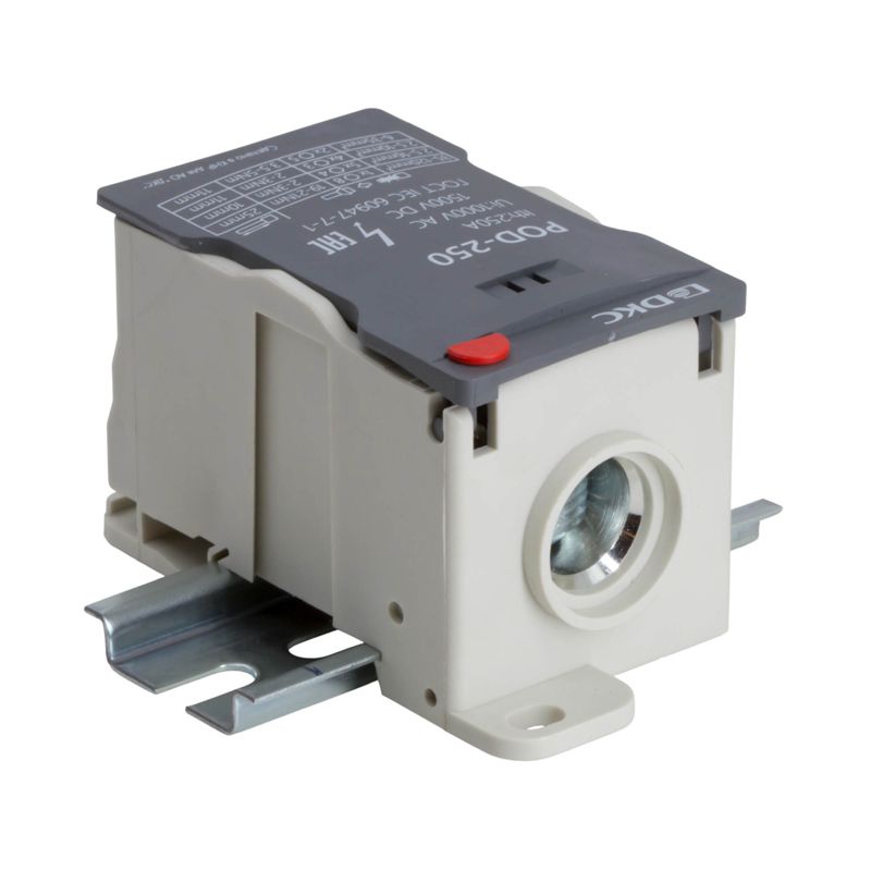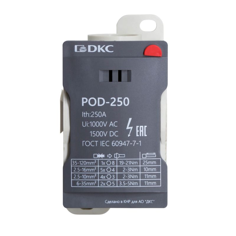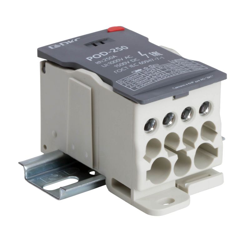 Распределительный блок POD-250 с винтовым зажимом служит для соединения и распределения ногожильных или обжатых наконечником гибких проводников в электрических щитах. Установка на DIN-рейку высотой 35 мм или монтажную плату. Боковой штифт обеспечивает стыковку блоков между собой. На крышке распределительного блока нанесена ключевая информация, а также есть паз для маркировки NUTB5. В комплект входит цветная пластиковая маркировка (синий, зеленый, красный, желтый) и самоклеящаяся (L1, L2, L3, N, заземление, круг). Корпус выполнен из полиамида с классом горючести V0 UL-94. Степень защиты – IP20. Цвет – серый, 1 ввод сечением 35-120 мм2, 11 точек подключения (выводов) с номинальным сечением проводников 2,5-35 мм2. Габариты (В?Ш?Г) – 51,5?49?96,5 мм.