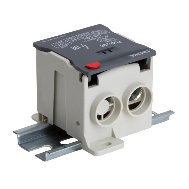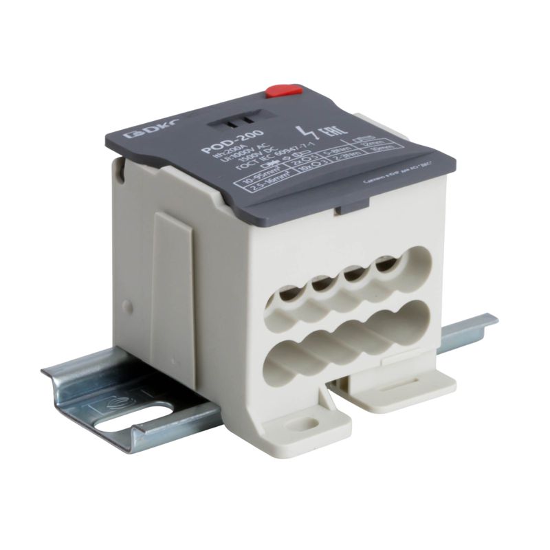 Распределительный блок POD-200 с винтовым зажимом служит для соединения и распределения многожильных или обжатых наконечником гибких проводников в электрических щитах. Установка на DIN-рейку высотой 35 мм или монтажную плату. Боковой штифт обеспечивает стыковку блоков между собой. На крышке распределительного блока нанесена ключевая информация, а также есть паз для маркировки NUTB5. В комплект входит цветная пластиковая маркировка (синий, зеленый, красный, желтый) и самоклеящаяся (L1, L2, L3, N, заземление, круг). Корпус выполнен из полиамида с классом горючести V0 UL-94. Степень защиты – IP20. Цвет – серый, 2 ввода с сечением 10-95 мм2, 10 точек подключения (выводов) с номинальным сечением проводников 2,5-16 мм2. Габариты (В?Ш?Г) – 50?50,5?67,5 мм.