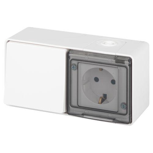 Блок розетка с выключателем влагозащищённый IP55 серии Эра Эксперт открытой установки цвет белый 11-7501-01. Номинальные характеристики 16А 250В. Устройство выполнено из качественного поликарбоната, оснащёно уникальными винтовыми клеммами ЭКСПЕРТ для максимально качественного зажима кабеля в механизме.