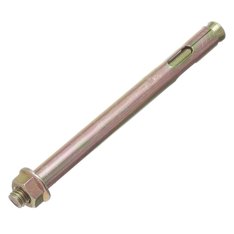 Анкерный болт с гайкой предназначен для монтажа тяжелых элементов (металлоконструкций, кронштейнов, ограждений, консолей, профилей и др.) к твердому основанию, способному выдержать вес конструкции, такому как: бетон, камень, полнотелый кирпич. Представляет собой сложное крепежное изделие, изготовленное из составных частей: шпильки с распором, внешней оболочки и гайки с запрессованной шайбой. Отличительная особенность конструкции в том, что при монтаже анкера с гайкой, шпилька начинает выступать за края анкера, увеличивая его общую длину. При закручивании гайки, шпилька с распором перемещается в сторону гайки, расклинивая, таким образом, внешнюю оболочку, которая, в свою очередь, упирается в стенки отверстия. Изготовлен из оцинкованной (желтопассивированой) стали.