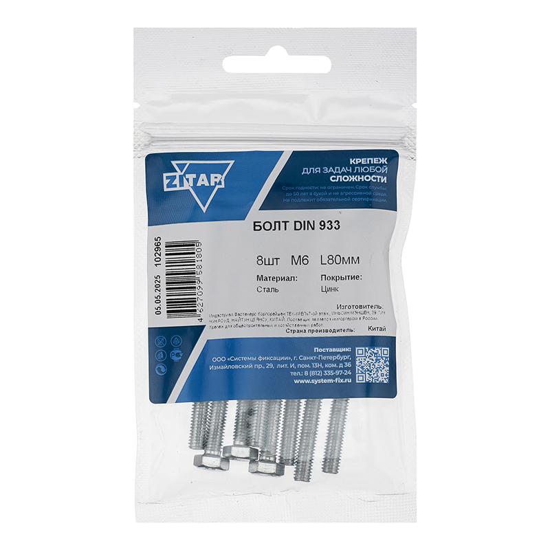 Болт с шестигранной головкой М6х80 DIN 933 оцинк. (уп.8шт) Tech-Krep/Zitar 102965