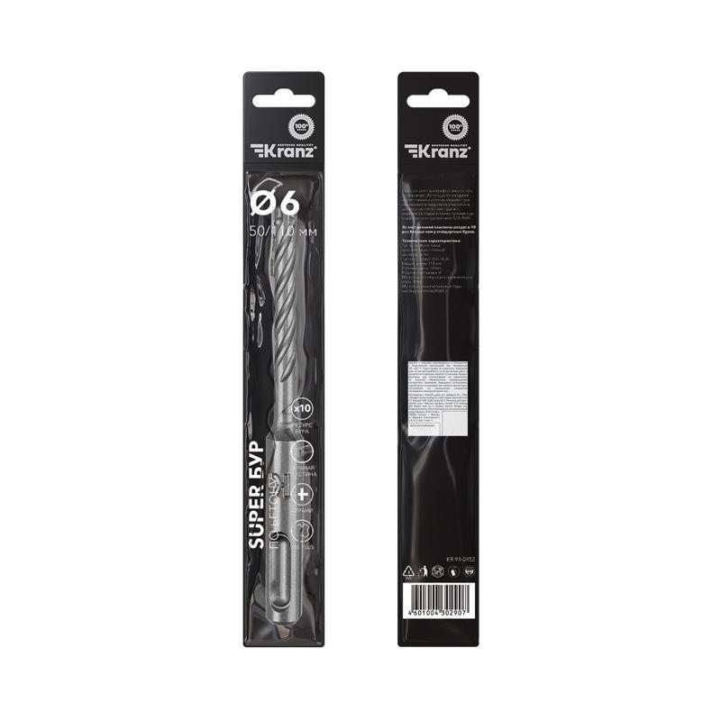 Бур по бетону SDS-Plus SUPER 6х110мм профессиональный цельная крестовая пластина Kranz KR-91-0452
