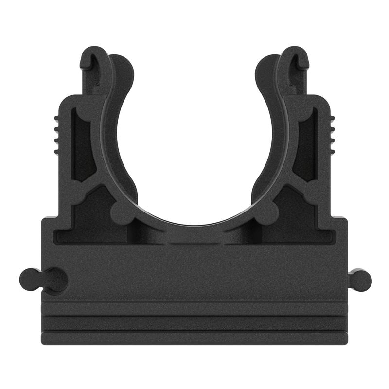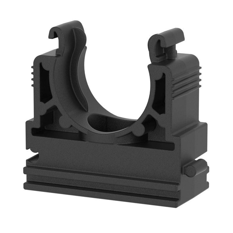 Держатель из полиамида фиксируется на поверхностях стен, потолков и т.п. и используется для крепления полиамидных труб. Внутренний диаметр держателя - 17 мм. Для более надежной фиксации желательно дополнительно использовать хомуты. Материал – полиамид (PA6.6). Цвет - черный. Температура эксплуатации – от –45 до +105 °С (выдерживает кратковременное воздействие до +150 °С). Не содержит галогенов.