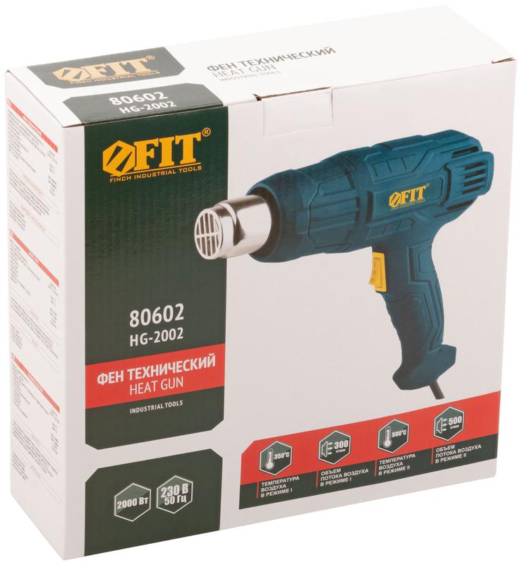 Фен технический FIT IT предназначен для монтажа термоусадочных пленок, снятия изоляции и старой краски, сушки поверхностей, пайки линолеума, полимерных изделий. Два температурных режима с различными потоками воздуха (клавишный переключатель) способствуют выполнению широкого спектра задач. 3 сменные насадки в комплекте позволяют контролировать поток воздуха. Термореле предотвращает перегрев фена. Есть возможность стационарной установки.