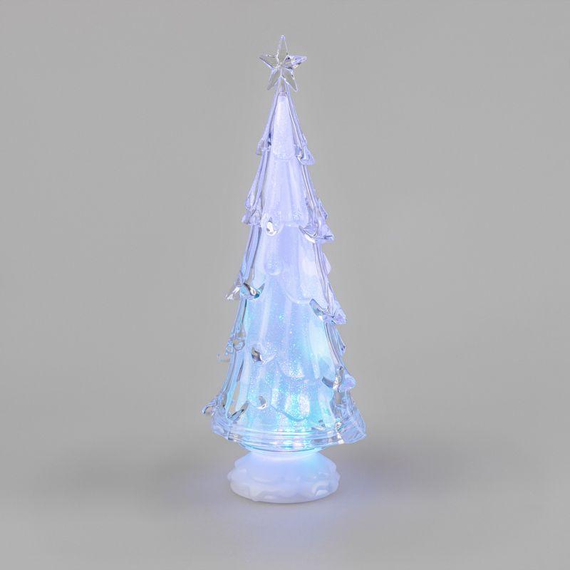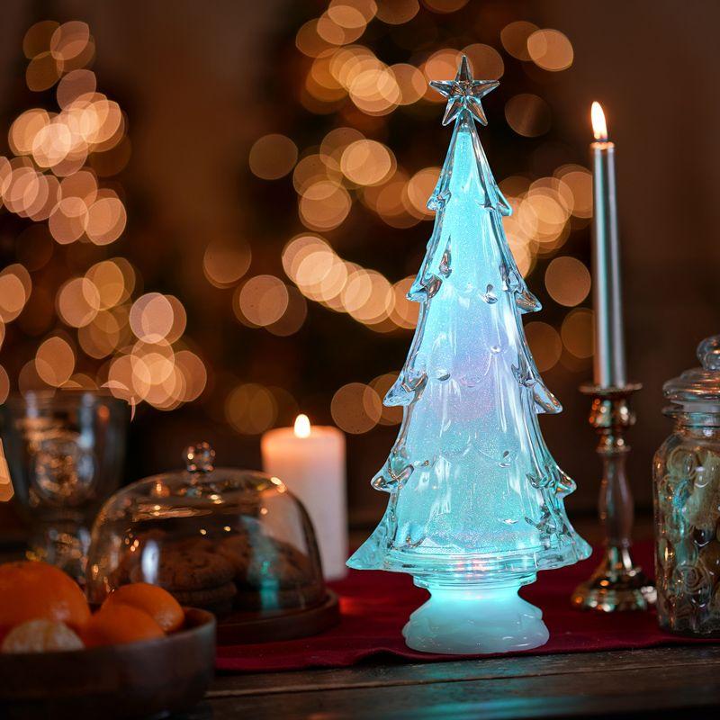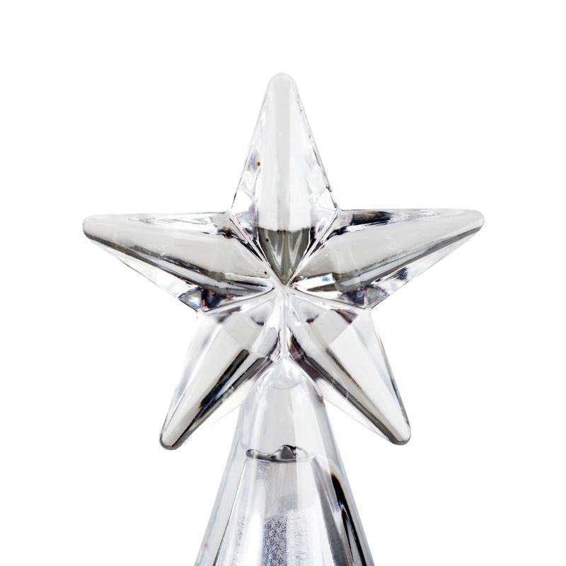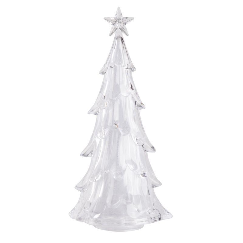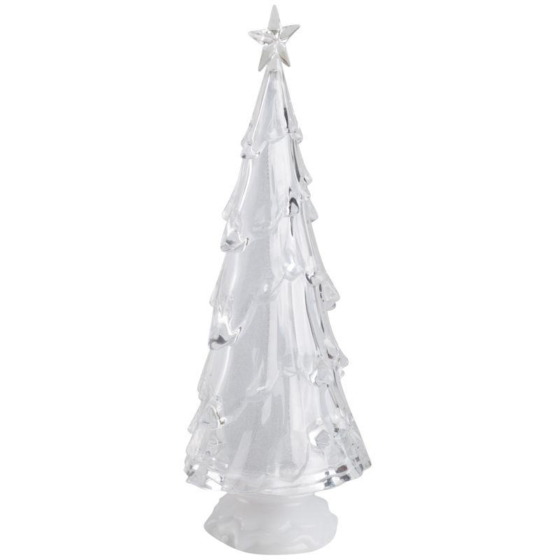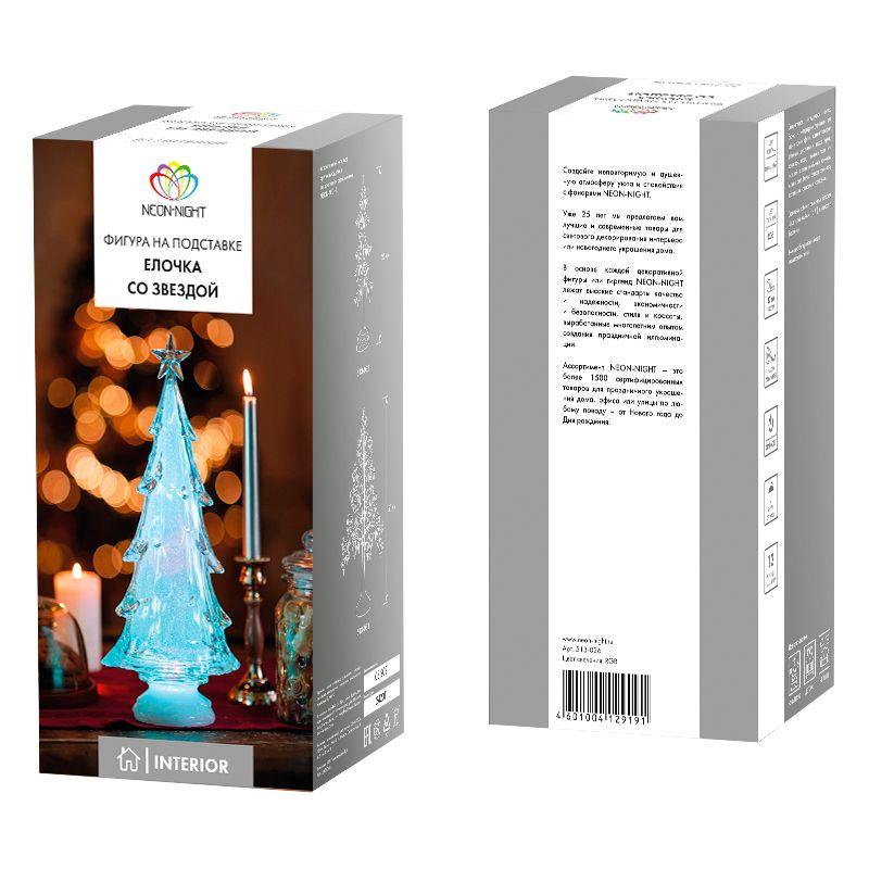 Фигура на подставке «Елочка со звездой» высотой 37 см станет великолепным украшением интерьера, который погрузит вас в атмосферу волшебной зимней сказки и подарит веселое праздничное настроение. Настольный декор выполнен в виде объемной новогодней ели, увенчанной звездой. Материал изготовления — прочный прозрачный пластик. В нижней части устойчивой подставки располагаются батарейный блок для 4 элементов питания типа ААА и удобная клавиша включения, выключения подсветки. Шесть экономичных RGB светодиодов светятся различными цветами, плавно меняя оттенки.