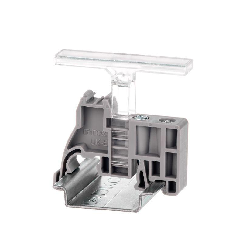 Торцевой фиксатор с винтовым зажимом из полиамида серого цвета толщиной 9,5 мм на рейку OMEGA 35 мм предназначен для фиксации и разделения клемм на рейке.