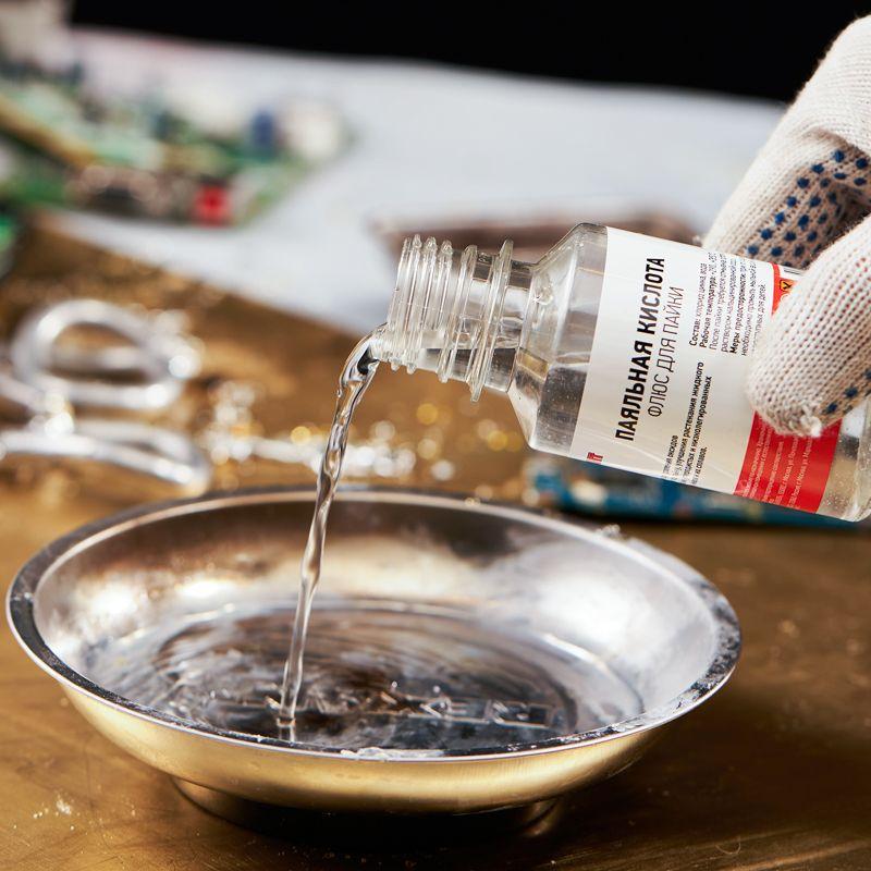 Паяльная кислота REXANT является одним из самых распространенных флюсов для пайки. Предназначена для удаления оксидов с поверхности под пайку и улучшения растекания жидкого припоя при пайке углеродистых и низколегированных сталей, меди, никеля и их сплавов. Применяется при пайке и лужении деталей припоями оловянно-свинцовой. Изготовлена в соответствии с ОСТ 4Г 0.033.200. Температура наибольшей активности: +290...+350°С. После пайки рекомендуется смыть остатки кислоты 5% раствором кальцинированной соды. Высокая проникаемость флюса позволяет легко обработать контакт в самых труднодоступных местах, а агрессивность способствует быстрому разрушению оксидной пленки на поверхности металла. Основные компоненты: хлорид цинка и вода. Вариант фасовки – флакон объемом 100 мл.