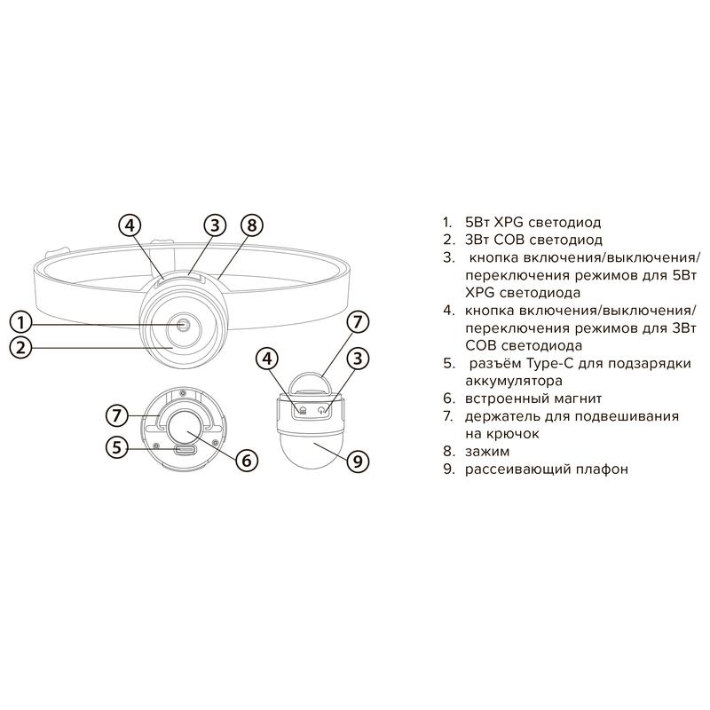 Регулируемый угол наклона головной части фонаря. В фонаре реализована возможность включения и выключения жестами руки. Фокусировка линзы позволяет увеличивать дальность луча до 100 метров. Заряжается от USB (кабель входит в комплект поставки), встроенный литий-полимерный аккумулятор обеспечивает длительное время работы.