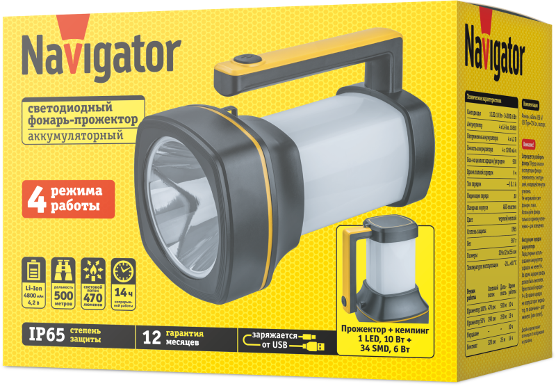 4 режима работы: луч 100 и 50% яркости, мерцание, кемпинг