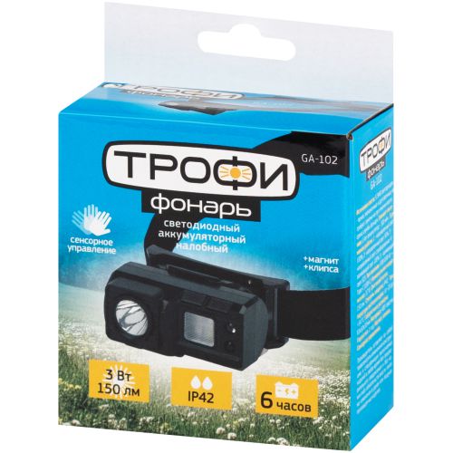 Фонарь светодиодный налобный GA-102 аккумуляторный 3Вт сенсорное управление магнит клипса 5 режимов Трофи Б0069569