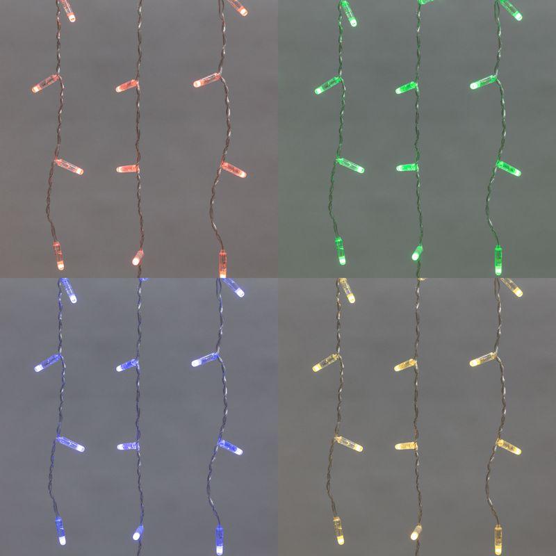 Гирлянда Айсикл (Бахрома) представляет собой гибкий горизонтальный шнур-шину, к которому через определенные промежутки крепятся вертикальные нити разной длины со светодиодами.