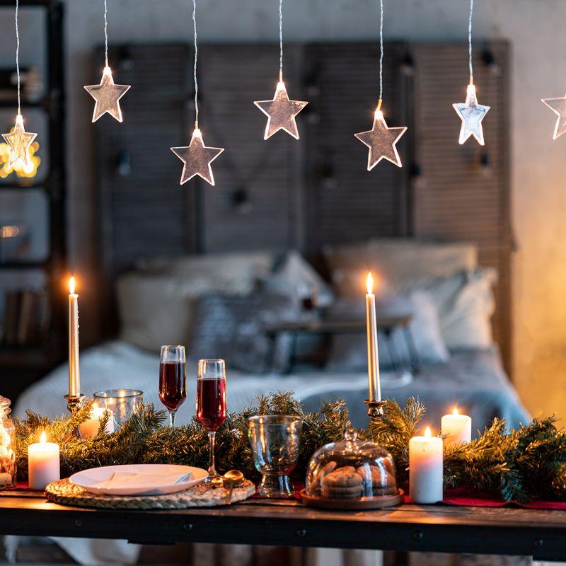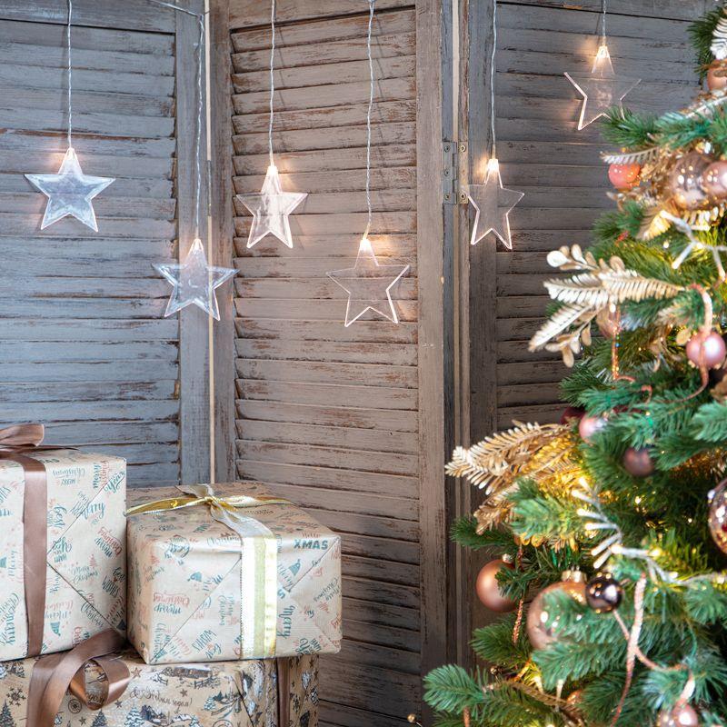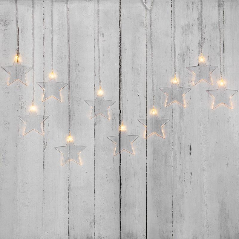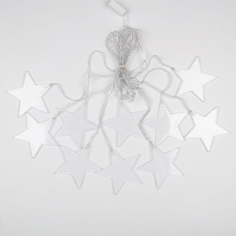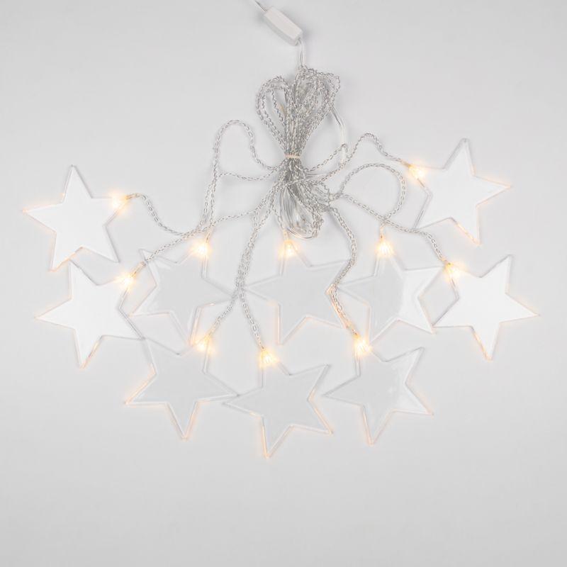 Гирлянда «Звезды» длиной 1,5 метра выполнена в виде бахромы. 10 диодов излучают белый свет теплого оттенка. Светодиоды не нагреваются, не вырабатывают вредный для зрения спектр и экономно потребляют электроэнергию. Вертикальные нити длиной 40 и 60 см удерживают 10 волшебных звезд размером 11,5 см. Гирлянда с ассиметричными нитями с защитой IP20 предназначена для использования в сухих отапливаемых помещениях и станет прекрасным украшением окна, арки, открытого дверного проема, свободного пространства между комнатами. Для подключения к розетке предусмотрен 3-метровый питающий шнур.