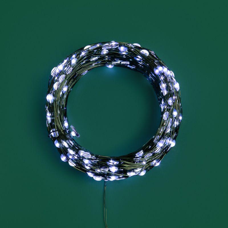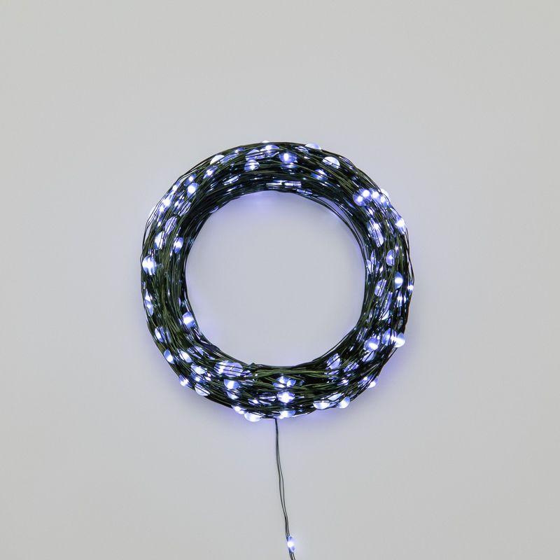 Гирлянда Роса длиной 50 метров представляет собой тонкий провод зеленого цвета, на котором горят и мерцают маленькие светодиоды, напоминающие капли росы.
