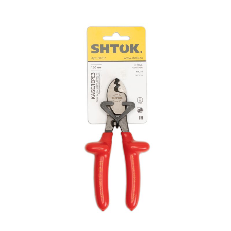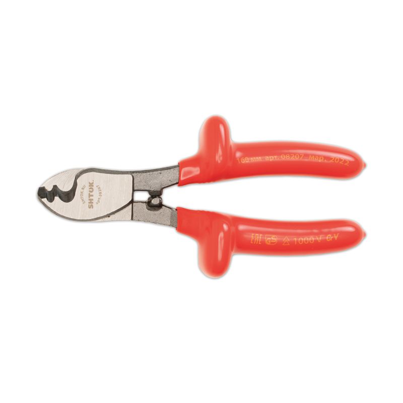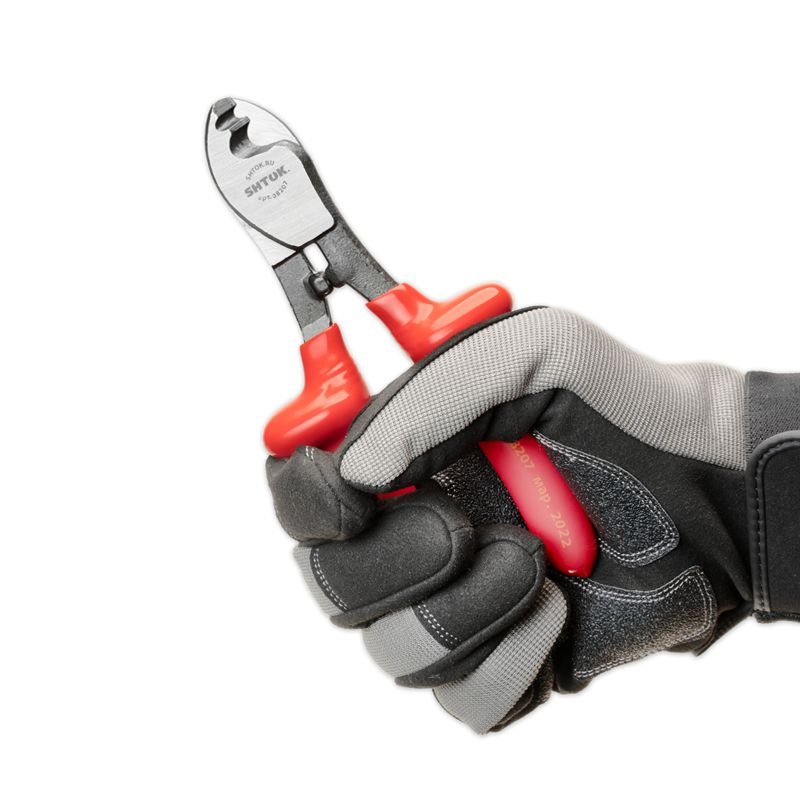 Рукоятки из двухслойного пластизоля со специальными упорами обеспечивают надежность удержания диэлектрического кабелереза SHTOK 08207 во время работы.