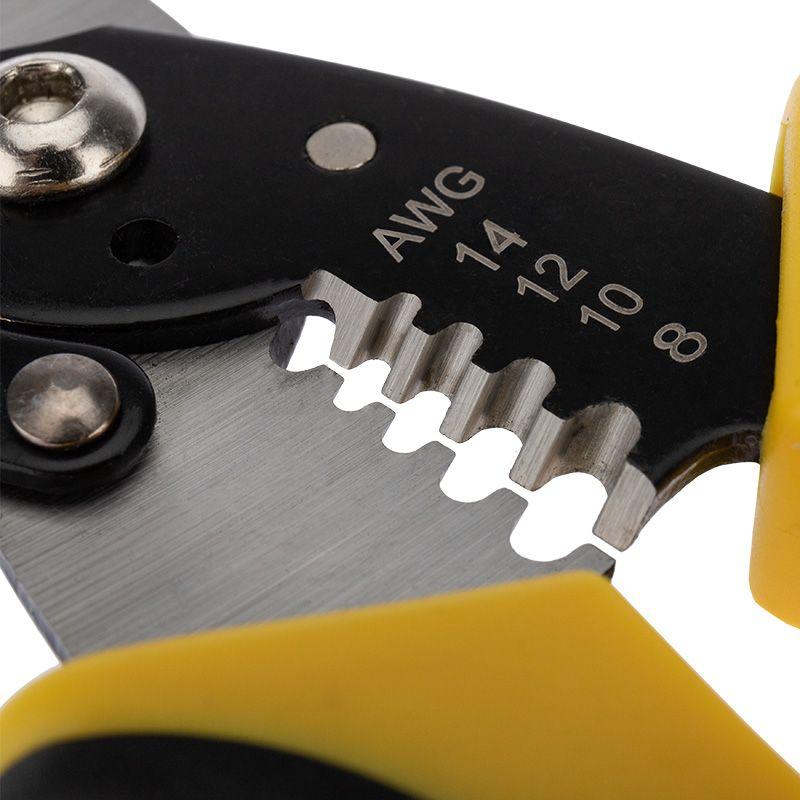 Инструмент 2 в 1 (стриппер и ножницы) предназначен для разрезания медных и алюминиевых одножильных и многожильных проводов диаметром до 13,5 мм, а также для удаления изоляции сечением 0,5–6 мм2.