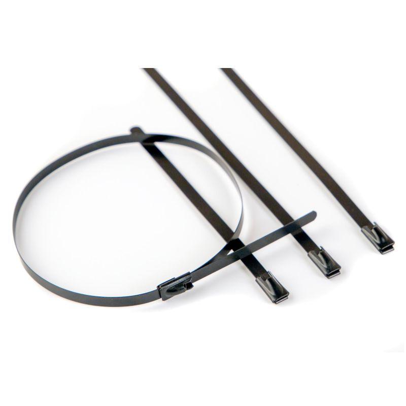 Хомуты из нержавеющей стали с эпоксидно-полиэстерным (ЭП) покрытием предназначены для монтажа трасс в условиях широкого диапазона температур и в условиях экстремально больших перепадов температур, химически агрессивных сред и больших нагрузок на разрыв, а также для монтажа в условиях особых требований по защите соединяемых материалов от контакта разнородных металлов для уменьшения коррозии. Материал полосы и замка – нержавеющая сталь 316. Сталь 316 устойчива к коррозии в агрессивных средах, а также к большинству внешних воздействий, имеет свойство сохранять целостность структуры при повышении и понижении температур. Эпоксидно-полиэстерное покрытие решает вопрос совместимости материалов (ГОСТ 9.005-72), используемых для монтажа. Температура эксплуатации от -80 до +150 °С. Предельная нагрузка – от 47 до 204 кг (ширина 12 мм) на замкнутое кольцо. Размеры: ширина - 7.9 мм, длина - 200 мм.