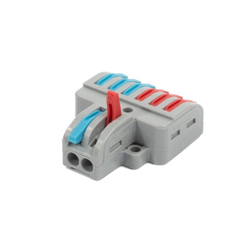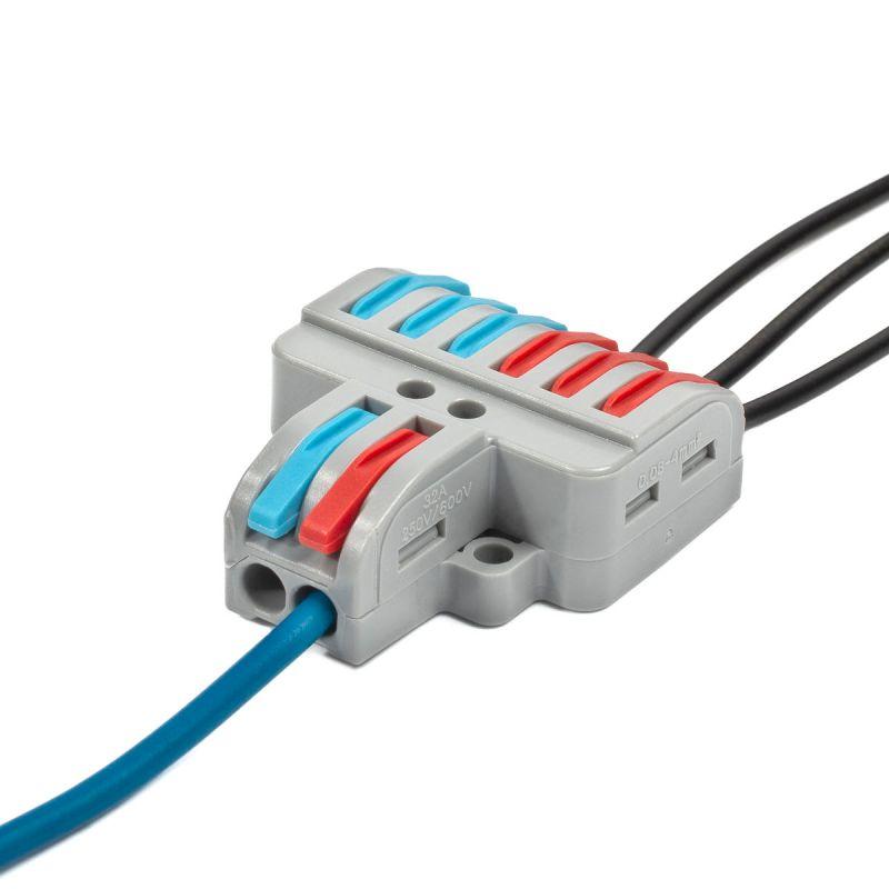 • Универсальные изолированные клеммы для ответвления любых типов медных проводников: моножильных и многожильных тонкопроволочных • Клеммы имеют монтажную площадку, позволяющую устанавливать клемму на плоскую поверхность или в монтажную коробку • Зажим проводов в клемме осуществляется при помощи рычагов • Наличие специального паза в корпусе клеммы для размещения рычага в закрытом положении надежно предотвращает случайное отсоединение проводника • Возможность измерения электрических параметров цепи без разбора и нарушения изоляции соединения • Безопасность и порядок в распределительной коробке • Максимальное напряжение: 450 В