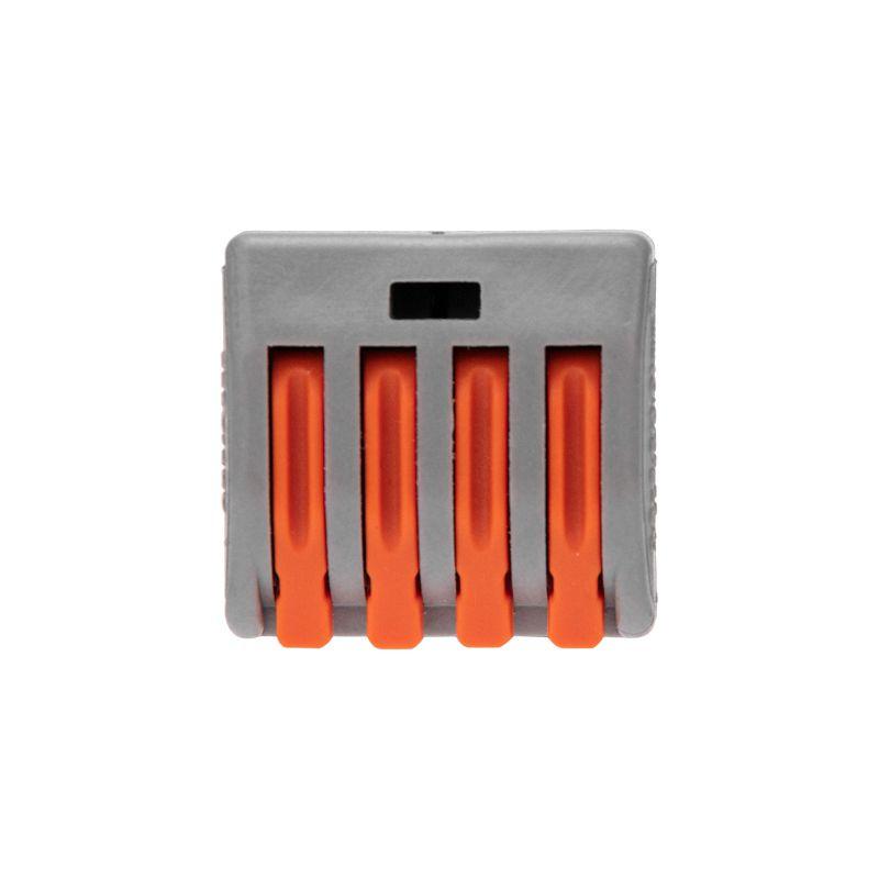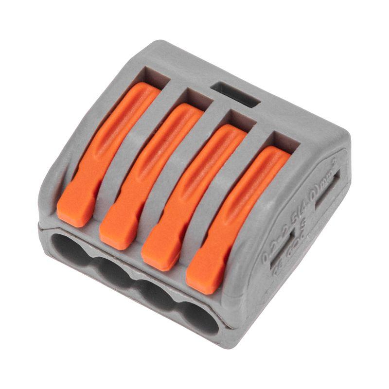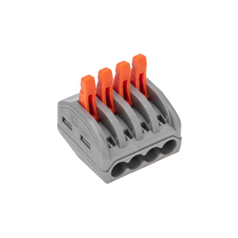 Соединительная многоразовая клемма СМК 22-414 тм REXANT на 4 проводника с плоско-пружинным зажимом предназначена для подсоединения медных одножильных и многожильных зачищенных проводников тонкого сечения.