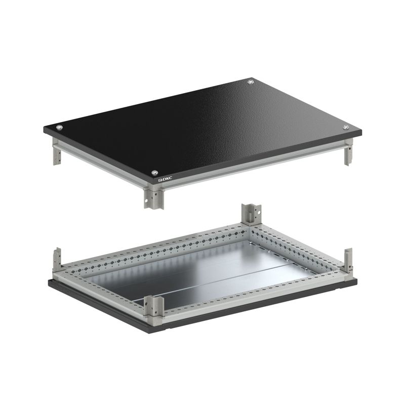 Комплект "Крыша и основание" используется для сборки корпуса. В комплект входят основание, крыша, комплект донных пластин, направляющие для монтажной платы, ручка с двойной бородкой 3 мм и монтажные аксессуары. Материал основания и крыши — сталь толщиной 1,5 мм с порошковым покрытием RAL 9005. Материал профиля — оцинкованная сталь толщиной 1,5 мм с порошковым покрытием RAL 7035. Размер ШхГ: 600х600 мм.