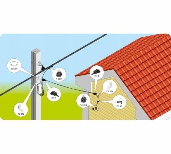 1 фазный комплект абонентского подключения НИЛЕД 14200401 для однофазного ввода электричества в дом проводом 2х16 мм2. Комплект состоит из изделия для опоры и фасада: абонентские кронштейны, крепежный хомут, зажимы для проводов ввода, фасадное крепление, ответвительные зажимы.