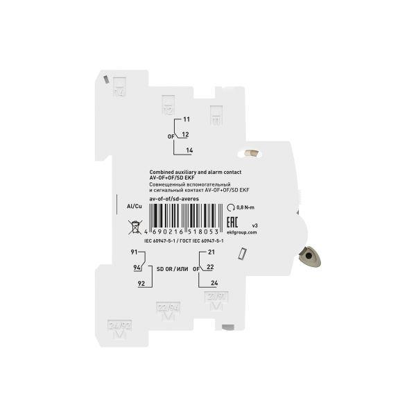 Совмещенные вспомогательные и сигнальные контакты AV-OF+OF/SD. EKF предназначены для применения во вспомогательных цепях управления, сигнализации переменного и постоянного тока. Функция дополнительного контакта AV-OF информирует о состоянии ВКЛ-ОТКЛ контактов аппарата, а функция сигнального контакта информирует о срабатывании аппарата по аварии (AV-6, AV-10, DV, DVA-6, DVA-10, AVN до 63А, ВА 47-63N, ВН-63N), к которому он присоединен.