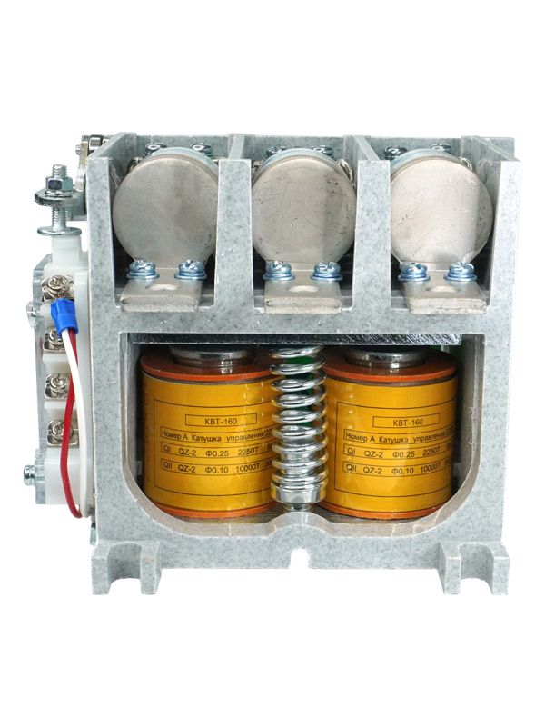 Контакторы вакуумные серии КВТ открытого исполнения с естественны воздушным охлаждением, встраиваемые в комплектные устройства, предназначены для использования в пускателях, станциях управления, для коммутации токов включения и отключения асинхронных электродвигателей с короткозамкнутым ротором и других приёмников электроэнергии в системах дистанционного управления электроприводами с тяжёлым режимом работы в цепи переменного тока 50-60 Гц, напряжением до 1140 В. Благодаря высокой электрической прочности вакуумного промежутка и отсутствию среды, поддерживающей горение дуги, электрическая дуга распадается и гаснет. * Высокий коммутационный и энергетический ресурс; * Высокая кратковременная нагрузочная способность для тяжелых пусков; * Отсутствие открытой электрической дуги и продуктов горения, * Высокое быстродействие; * Максимальная пожаро- и взрывобезопасность; * Низкий уровень шумов во время эксплуатации.