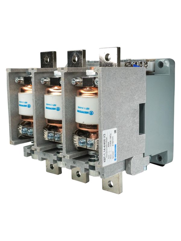 Контакторы вакуумные серии КВТ открытого исполнения с естественны воздушным охлаждением, встраиваемые в комплектные устройства, предназначены для использования в пускателях, станциях управления, для коммутации токов включения и отключения асинхронных электродвигателей с короткозамкнутым ротором и других приёмников электроэнергии в системах дистанционного управления электроприводами с тяжёлым режимом работы в цепи переменного тока 50-60 Гц, напряжением до 1140 В. Благодаря высокой электрической прочности вакуумного промежутка и отсутствию среды, поддерживающей горение дуги, электрическая дуга распадается и гаснет. * Высокий коммутационный и энергетический ресурс; * Высокая кратковременная нагрузочная способность для тяжелых пусков; * Отсутствие открытой электрической дуги и продуктов горения, * Высокое быстродействие; * Максимальная пожаро- и взрывобезопасность; * Низкий уровень шумов во время эксплуатации.