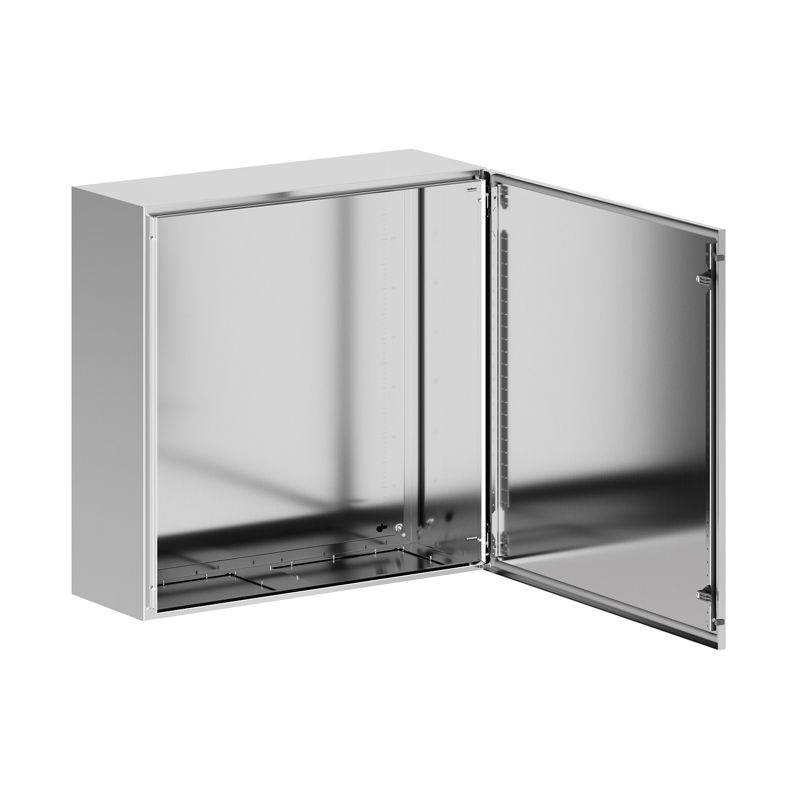 Навесные корпуса серии STH предназначены для систем автоматизации и распределения электроэнергии, эксплуатирующихся в коррозионно-активных средах - области с высокой влажностью, соляной и морской туман, химически агрессивные среды, открытые пространства с высокой концентрацией загрязняющих веществ. Корпус, дверь, фланец изготавливаются из нержавеющей стали AISI 316 (1.4401) толщиной 1,5 мм. Литой уплотнитель двери и фланца - вспененный силикон. Монтажная плата изготовлена из оцинкованной стали толщиной 1,8 мм. Степень защиты IP66, ударопрочность IK10, сейсмостойкость 9 баллов по шкале MSK-64, климатическое исполнение УХЛ1, ОМ2, ОМ3, группа горючести НГ. Комплект поставки: корпус, дверь реверсивная, монтажная плата с двунаправленной разметкой, дверные рейки, поворотный замок 2 шт., сплошной фланец для ввода кабеля 2 шт., комплект заземления без проводов. Габариты 800x800x300 (ВхШхГ) мм.