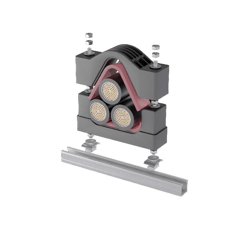 Кабельное крепление из полиамида армированного стекловолокном предназначено для фиксации кабеля высокого напряжения в треугольник. Изделие сконструировано таким образом, что при максимальных диаметрах кабеля для данного вида креплений верхняя и нижняя части находятся в постоянном зацеплении, что снижает изгибающие нагрузки на крепежный элемент и повышает тем самым прочность конструкции к механическим нагрузкам при возникновении токов КЗ. Изделие одинаково эффективно к атмосферным воздействиям, воздействию масел и других нефтепродуктов. Механическая стойкость к динамическим нагрузкам – 40 000 H.