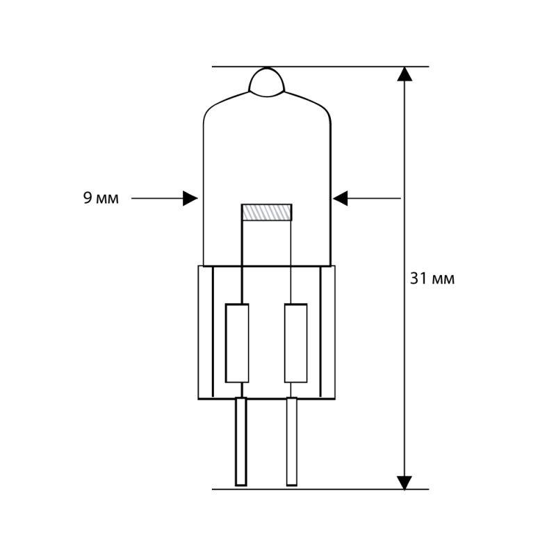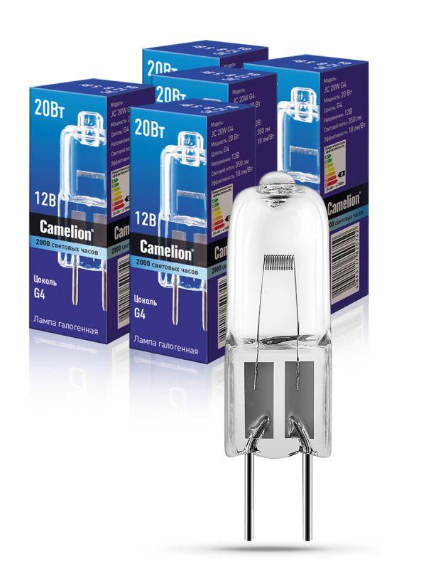 Лампа галогенная JC 20Вт 12В капс. g4 Camelion 1955 – низковольтная лампа без отражателя, с прозрачной колбой, длиной 31 мм, с цоколем g4, мощностью 20 Вт. Цветовая температура 2850 К.