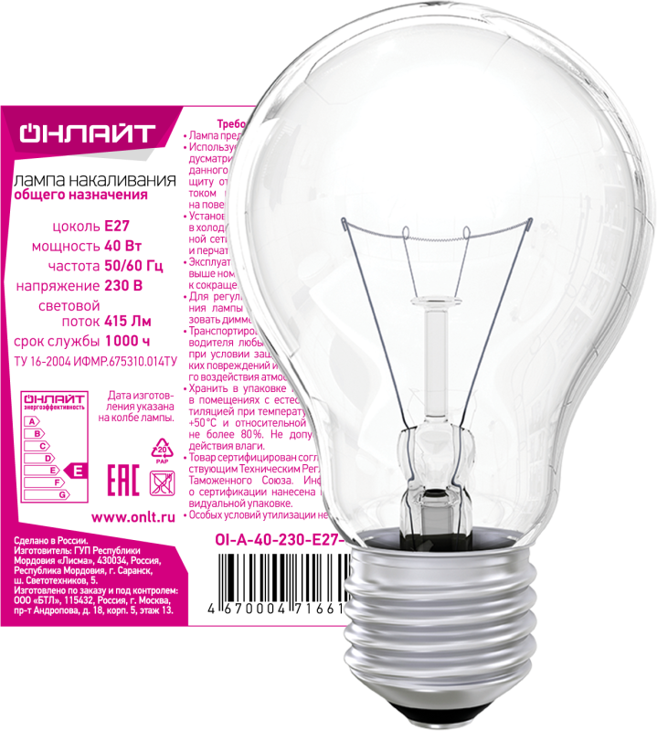Лампа накаливания 71 661 OI-A-40-230-E27-CL 40Вт E27 220-230В ОНЛАЙТ 71661