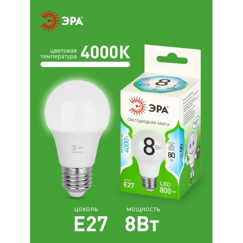 Светодиодная лампа ЭРА LED A60-8W-840-E27 GL серии Green Line — эффективное решение для основного освещения. Лампочка Е27 мощностью 30 Вт излучает нейтральный белый свет (4000K) без мерцания. Классическая колба A60 (груша) и стандартный цоколь E27 делают её совместимой с люстрами, бра, настольными и напольными светильниками. Высота лампы: 108 мм. Светодиоды потребляют меньше электроэнергии и служат значительно дольше традиционных ламп накаливания: до 30 000 часов. Работает от сети 220 В, эквивалентна 80 Вт лампе накаливания. Светодиодные лампы ЭРА подходят для жилых и коммерческих помещений и обеспечивают стабильное освещение.
