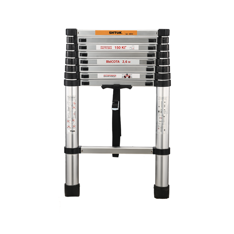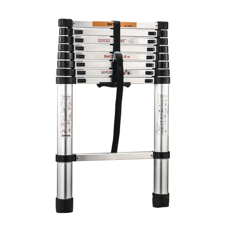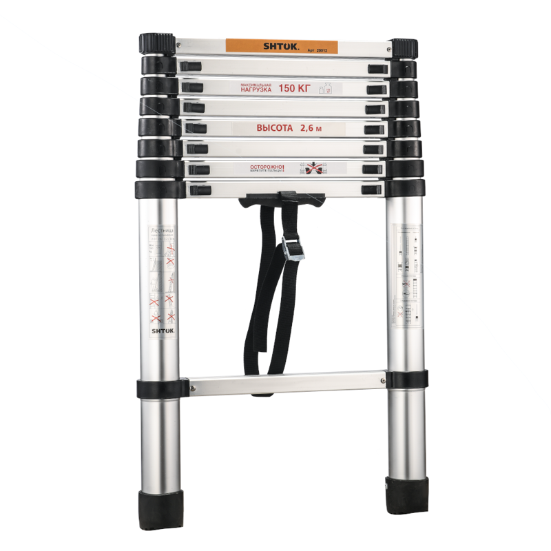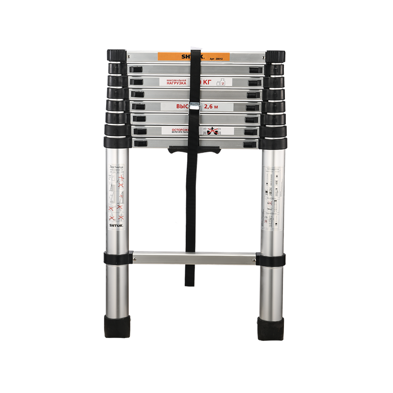 Телескопическая лестница SHTOK 2.6м 20012 пригодится для прокладывания электрических кабелей, монтажа и демонтажа вывесок, сбора урожая, покрасочных работ и многих других задач на высоте.