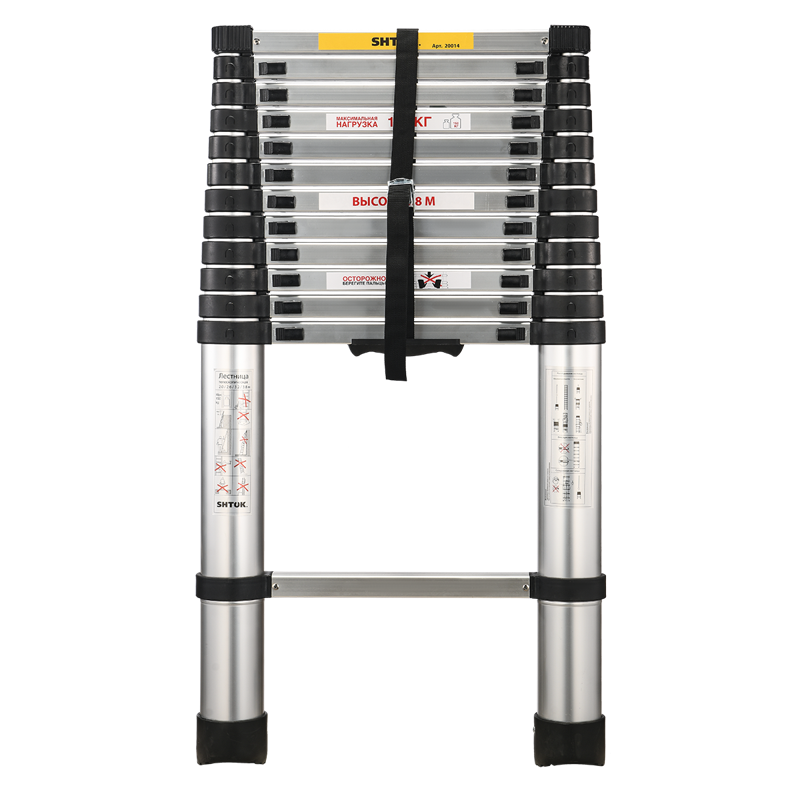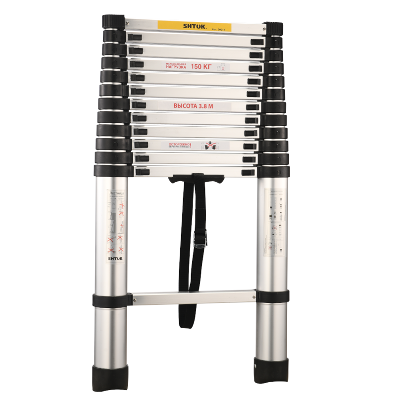 Телескопическая лестница SHTOK 3.8м 20014 выдерживает нагрузку до 150 кг за счет конструкции, выполненной из дюралюминия и первичного пластика. На стенде испытываемая лестница выдерживает 10 000 циклов на раскрытие-закрытие.