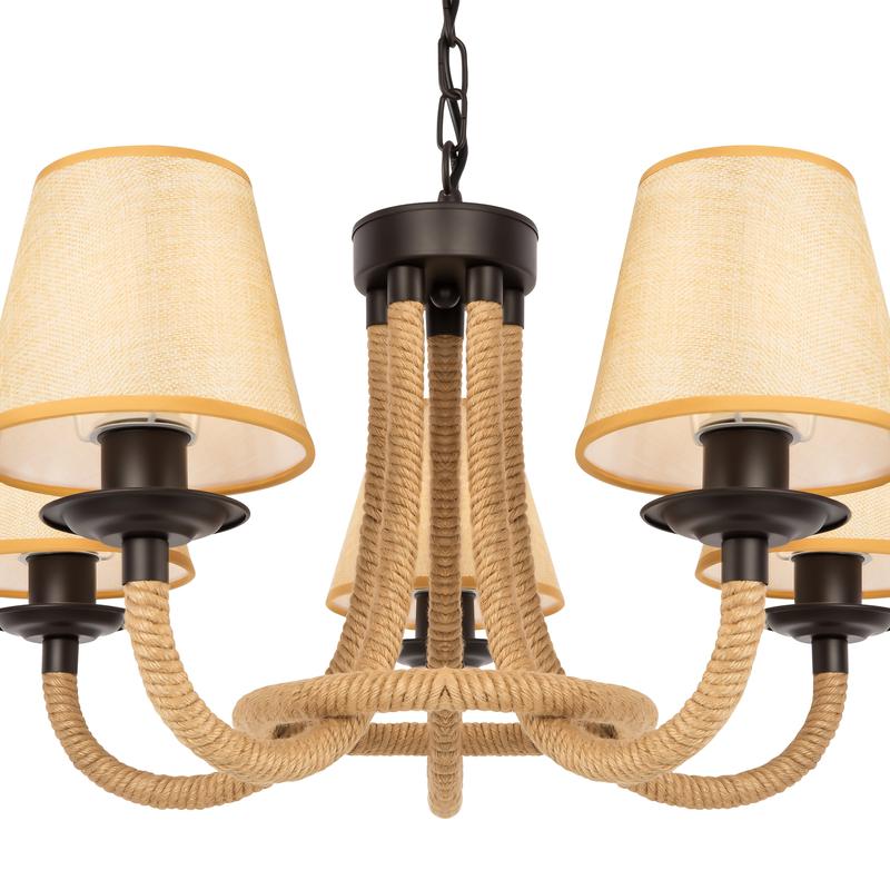 Серия светильников создана под влиянием основных принципов эко-дизайна, с использованием натуральных материалов для предметов интерьера. Арматура люстры из матового черного металла с легким золотым патинированием гармонично сочетается с абажурами из холщовой натуральной ткани. Рожки и центральная часть люстры плотно обвиты холщовой веревкой. Окантовка на верхней и нижней части абажура желто-песочного цвета.