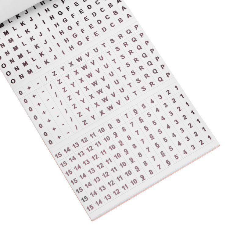 Набор состоит из 10 листов, на каждом из которых расположено 45 наклеек: цифры от 0 до 15, английский алфавит от A до Z, знаки +, -, /. Одна наклейка состоит из 7 знаков.