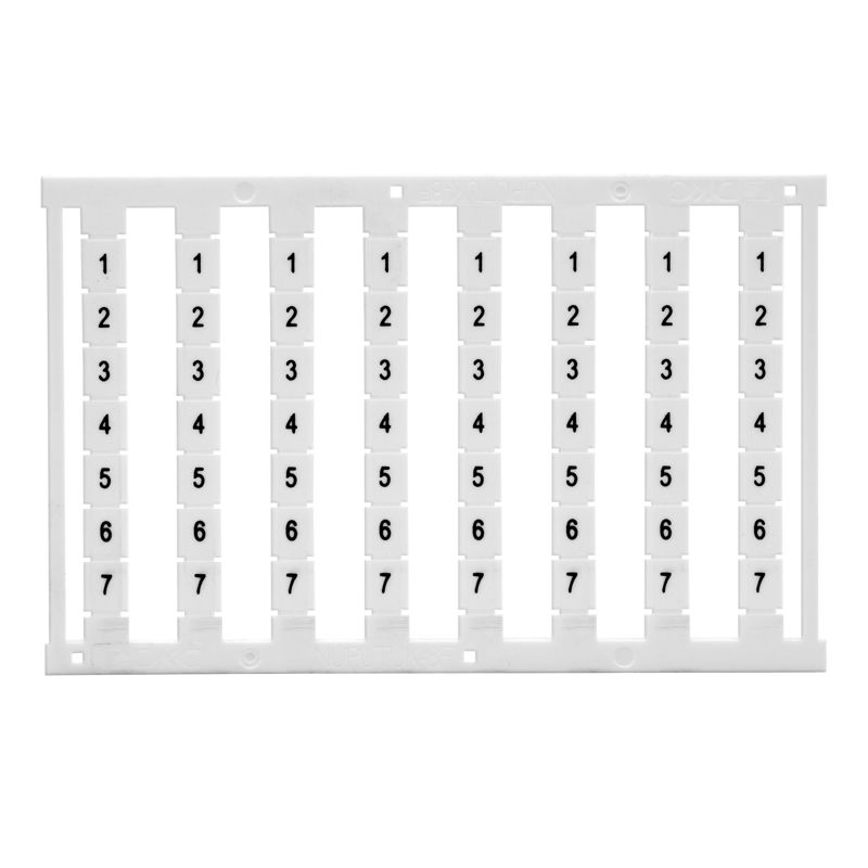Узкая маркировка для боковой маркировки клемм Push-in: белые маркеры шириной 5 мм, черная печать от 1 до 12, с горизонтальной ориентацией. Поставляются в виде карты из 96 штук и применяются для долговечной и наглядной идентификации клемм в электрических сборках и щитах.