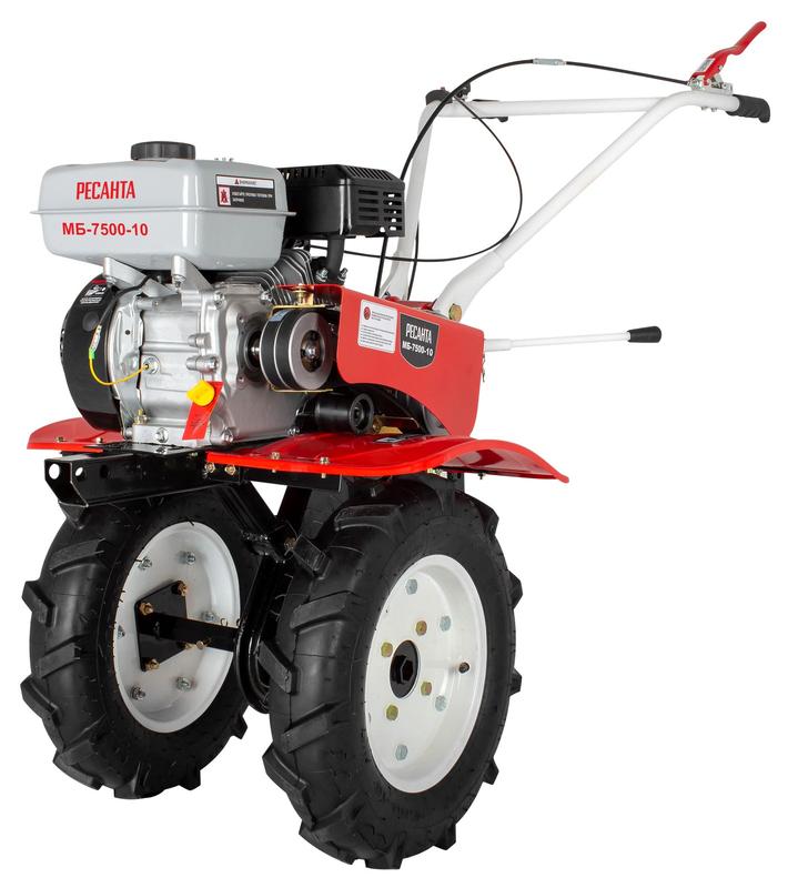 МБ-7500P-10 Ресанта - универсальная сельскохозяйственная машина с бензиновым четырехтактным двигателем мощностью в 7,5 л.с. Для заправки можно использовать обычный бензин АИ-92 или А-95 без добавок. Расход топлива 375 гр/кВт в час. Объем бака 3,6 л.