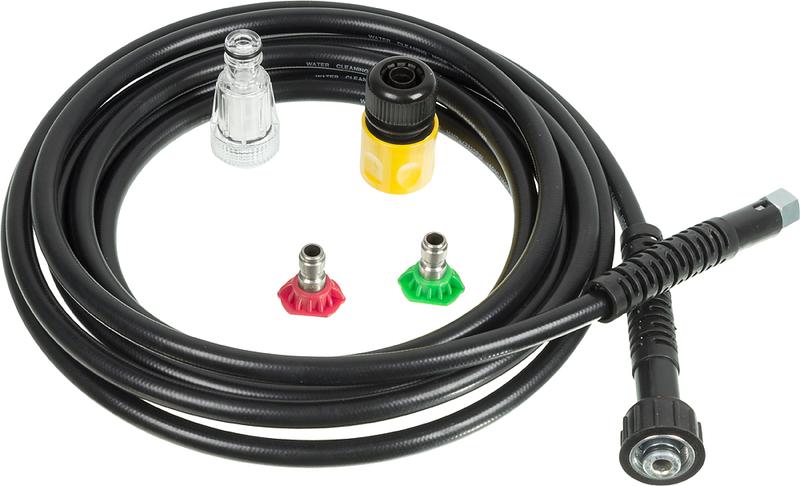 Производитель максимально продумал конструкцию мини-мойки, с тем чтобы сделать устройство безопасным, удобным и экономичным. Модель отличается компактностью и малым весом, оснащена колесами и ручкой для простоты перемещения. Устройство комплектуется шлангом длиной 5 м, что существенно облегчает забор воды и проведение работ.