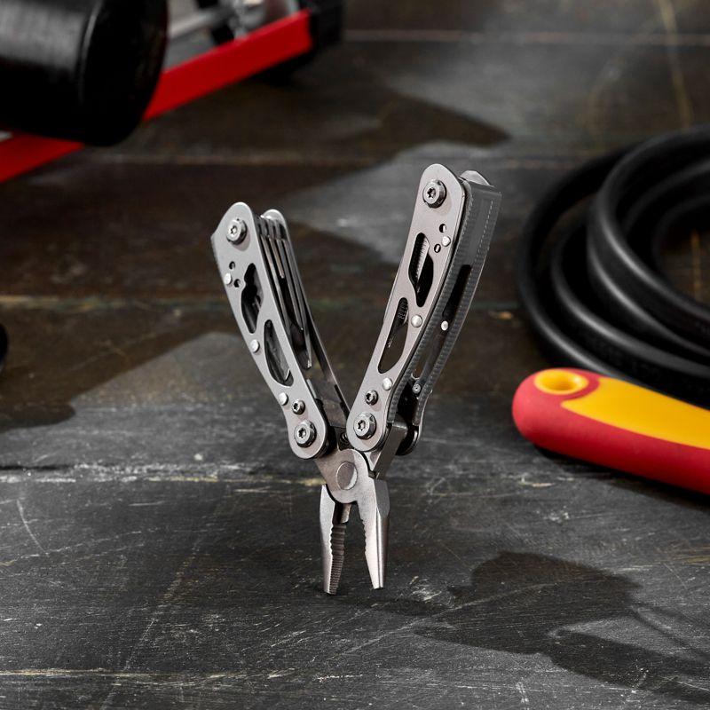 Он выполняет сразу 10 полезных в быту и на отдыхе функций: плоскогубцы, кусачки, нож, отвертка шлицевая SL2, отвертка шлицевая SL3, отвертка крестовая PH1, пилка для ногтей, открывалка для бутылок с отверткой шлицевой SL4, нож с зазубринами и консервный нож.