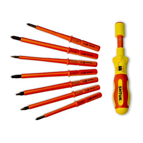 Набор диэлектрических отверток со сменными вставками 7+1, (в кофре, динамометрическая рукоятка 1-5 Нм) SHTOK 09350 используется для точной работы с крепежом. Инструмент рассчитан на незначительное усилие. Имеется предварительная настройка предельного значения усилия. По достижении установленной границы инструмент издает щелчок.