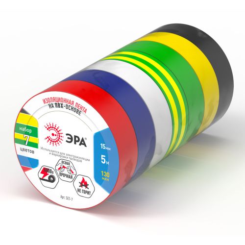 Набор изолент ЭРА из 7 мини роликов разноцветной изоляционной ленты. Диаметр ролика 42 мм, толщина ленты 0,13 мм, длина намотки ленты 5 метров. Изолента набор 15мм х 5метров х 0,13мм это оптимальный вариант для домашнего использования - ассортимент всех основных цветов в небольшом количестве. Изолента цветная ЭРА разработана и изготовлена на основе пленки из ПВХ - поливинилхлоридного изоляционного пластиката, используемой в производстве профессиональных изоляционных лент. Специальные добавки, входящие в состав данного материала, повышают эластичные свойства ленты, увеличивают ее долговечность и обеспечивают устойчивость к горению. Изоляционная лента предназначена для проведения всех видов электромонтажных работ : электрической изоляции проводников, сращиванию и жгутированию, защиты от механических повреждений, цветовой маркировки. Изоленты ЭРА соответствуют ГОСТ Р 16214-86. Изолента ПВХ справится с высоким напряжением: напряжение пробоя не менее 6000В. Изолента обеспечивает электробезопасность соединений на долгое время. Изоляция для проводов достаточно теплостойкая, обеспечивает надежную изоляцию соединений при высоких температурах. Устойчива к УФ-лучам. Изолента ЭРА не горит, затухает сразу при вынесении из открытого огня. Электромонтаж и проводка не обходится без изоленты ЭРА. В цветной набор входит: изолента черная , изолента красная, изолента желтая, изолента белая, изолента зеленая, изолента желто-зеленая и изолента синяя.