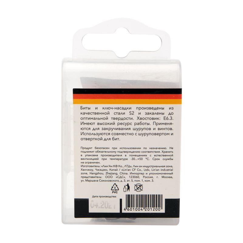 Насадки изготовлены из легированной высокопрочной стали S2, что дает повышенную устойчивость к изломам и деформации в наиболее нагружаемых точках касания. Размеры наконечников подходят для работы с крепежом с внешним шестигранником диаметром 8 и 10 мм, а также для шлицев типа PH и PZ с резьбовым диаметром 3,1 – 5 мм. Намагниченные наконечники облегчают крепление и фиксацию крепежа на бите. Шестигранный хвостовик подходит для установки на все виды шуруповертов и отверток-адаптеров и не дает проворачиваться бите в патроне инструмента.