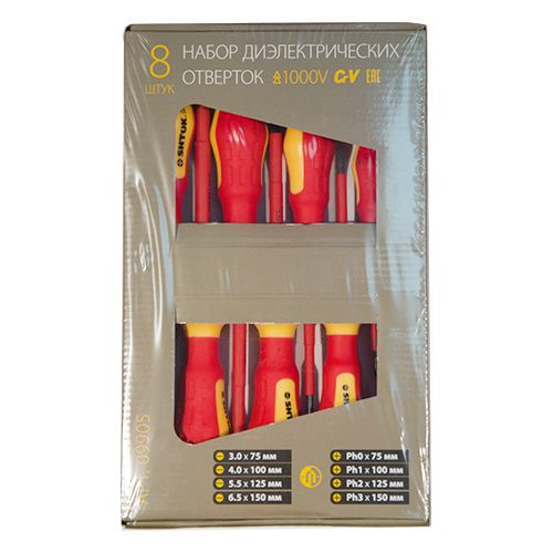 Набор диэлектрических отверток SHTOK 8 шт. картон 1000В 09905 состоит из диэлектрических отверток (четыре шлицевых и четыре крестовых). За счет наличия магнитного наконечника возможен монтаж в приборах, расположенных вертикально. Рабочая часть, выполненная из хром-молибден-ванадиевой стали, увеличивает прочность и износостойкость отверток. Набор поставляется в картонной упаковке. Особенности набора диэлектрических отверток SHTOK 09905 Удобство работы Черненый магнитный наконечник обеспечивает удобство монтажа в приборах, расположенных вертикально. Прочность Рабочая часть выполнена из хром-молибден-ванадиевой стали, что увеличивает прочность отверток.