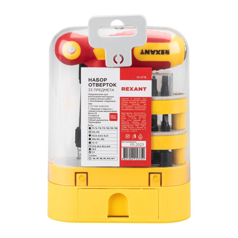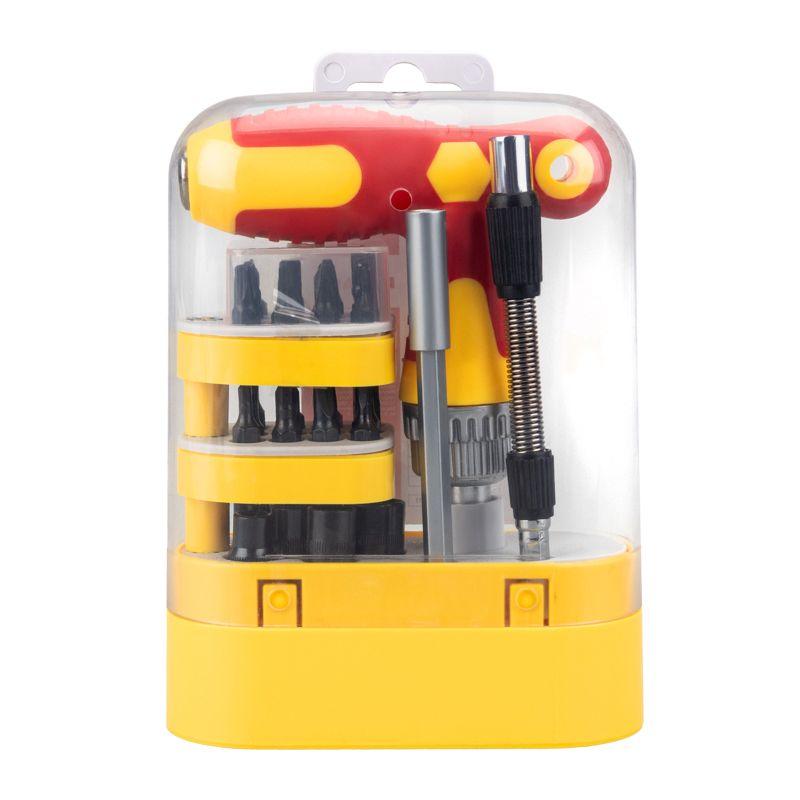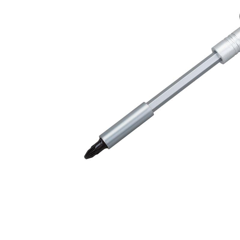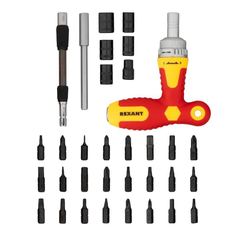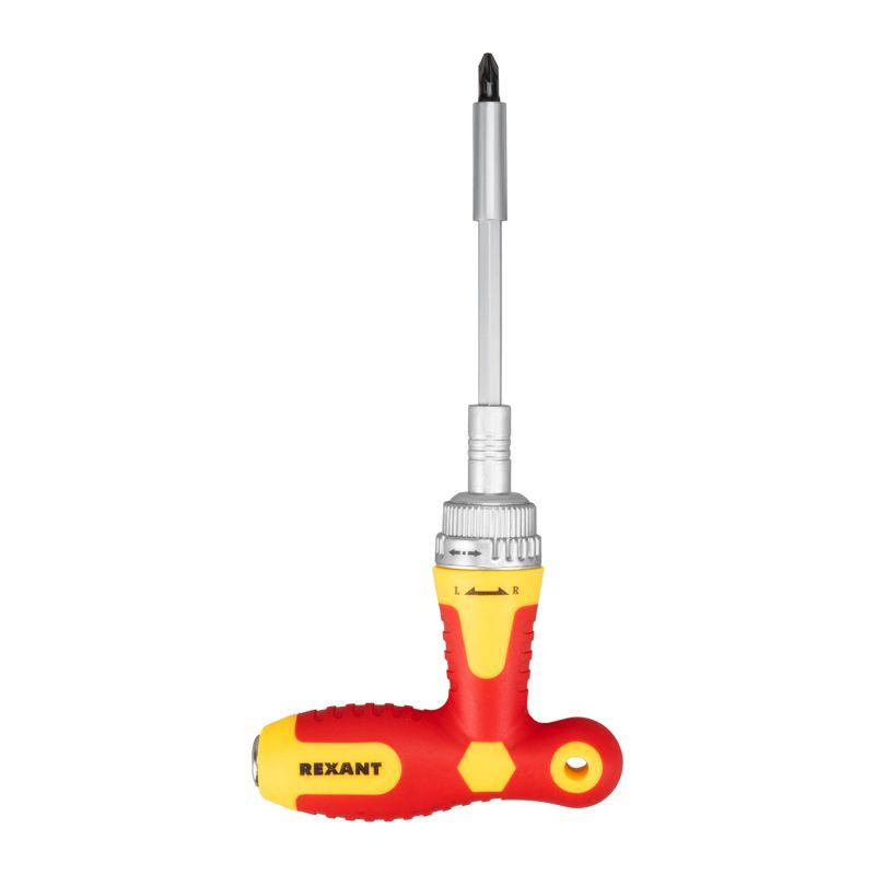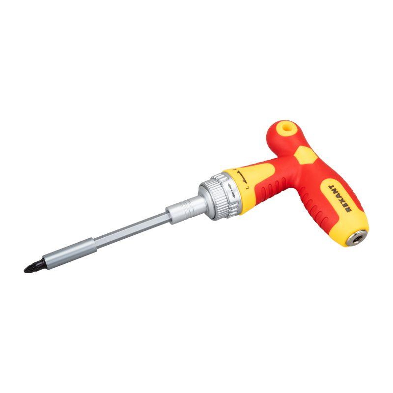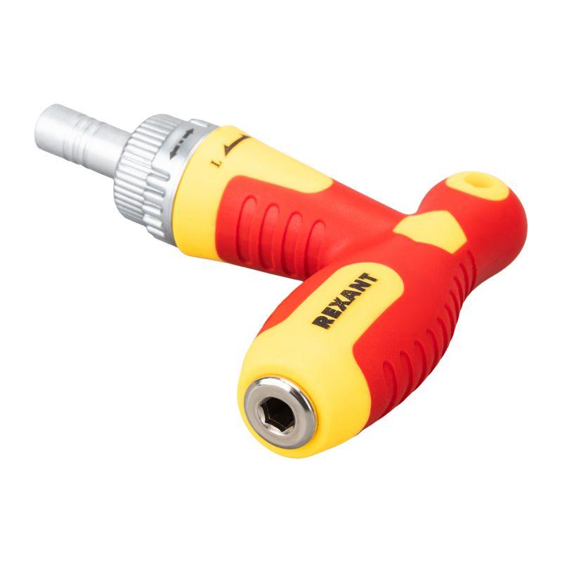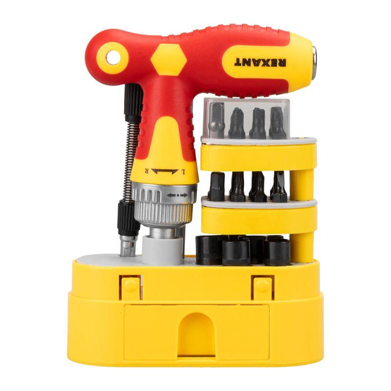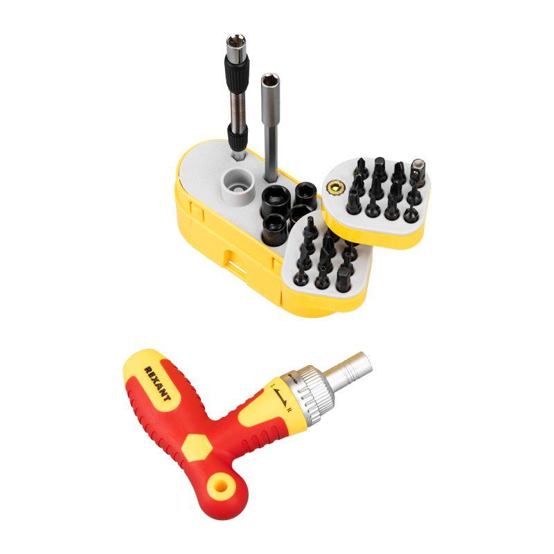 Т-образная отвертка 2 в 1 оснащена реверсивным механизмом (реверс по часовой стрелке/против часовой стрелки/фиксация), а также стандартным отверстием под насадки для создания классического инструмента. В основании есть отверстие, которое может использоваться для создания дополнительного рычага усилия при работе, если установить в него металлический пруток. Двухкомпонентная рукоятка оснащена магнитным держателем, что обеспечивает быструю замену и надежную фиксацию бит. Для удобства хранения и транспортировки набор поставляется в органайзере, который оснащен отсеком для хранения мелкого крепежа.