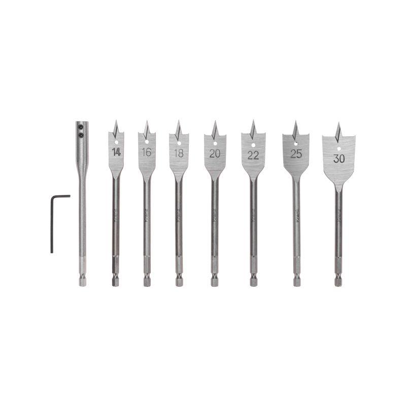 Набор состоит из перовых сверл диаметром 14-16-18-20-22-25-30х152 мм (7 шт.), удлинителя и углового ключа.