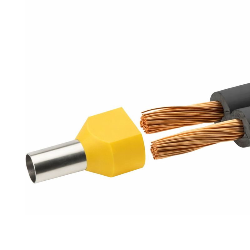 Наконечники-гильзы двойные (НШВИ2) предназначены для оконцевания многожильных сдвоенных проводников одинакового сечения класса гибкости 3 и выше с последующим подключением к пружинным или винтовым зажимам оборудования. Наконечники-гильзы двойные НШВИ-2 имеют широкую сферу применения. Активно используются при подключении автоматических выключателей, УЗО и другого оборудования для автоматизации и распределения. Форма изолированной манжеты и медной гильзы наконечников НШВИ-2 рассчитана на одновременный монтаж и подключение двух проводников. Длина контактной гильзы - 14 мм. Сечение провода - 6 мм2. Материал гильзы - медь M0 (содержание меди 99,99%). Цвет - желтый.