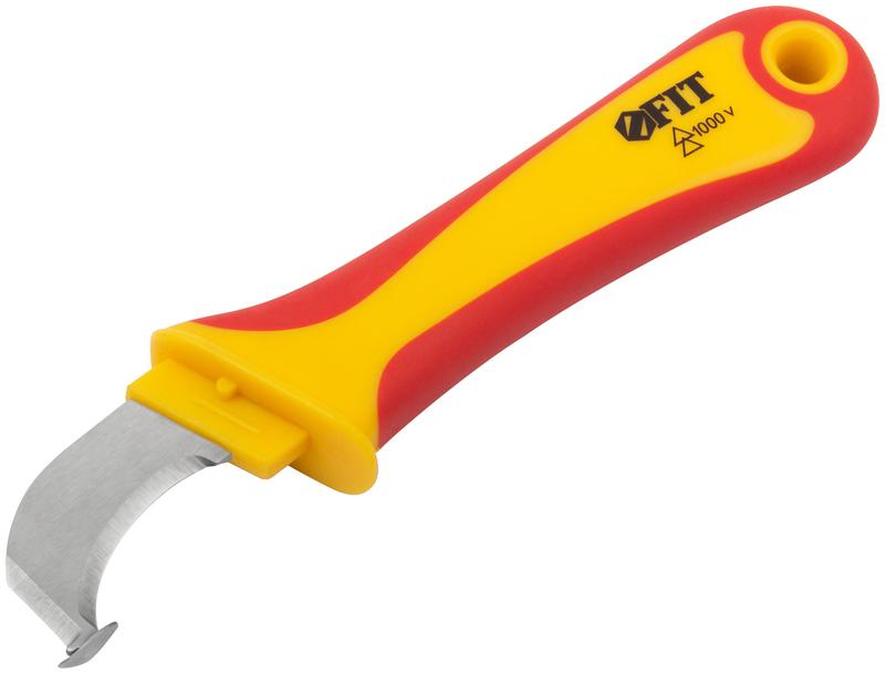 Нож для электромонтажных работ FIT IT с пяткой предназначен для снятия изоляции при напряжении до 1000 В. Пятка позволяет аккуратно снять изоляцию, не повредив при этом провод, что особенно важно для начинающих мастеров без опыта разделки кабелей. Диэлектрический нож с пяткой используется при работе с плоскими кабелями. Лезвие изготовлено из нержавеющей стали, рукоятка — пластиковая, прорезиненная. Пятка надежно и ровно приварена к лезвию. В комплекте поставляется защитный колпачок.